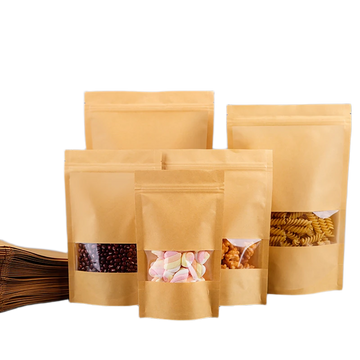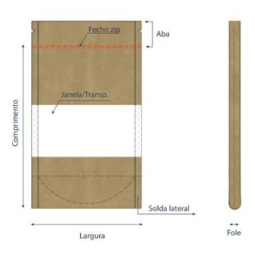Saco kraft, com fecho zip e uma janela em plástico para visualização do seu conteúdo.